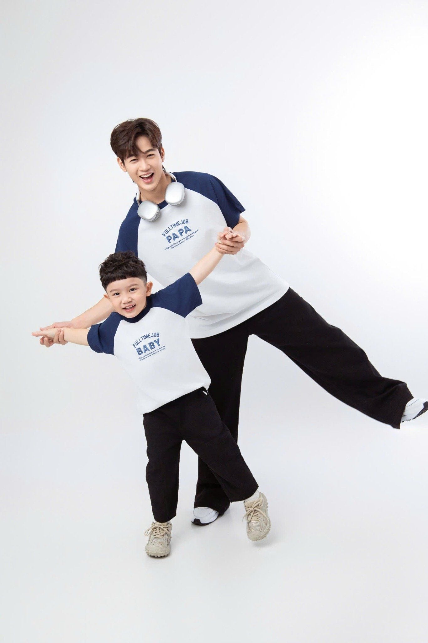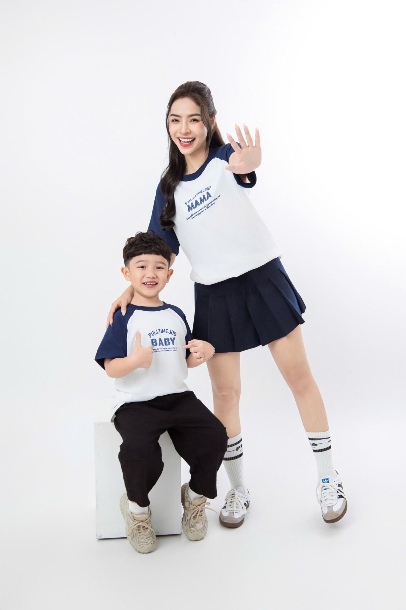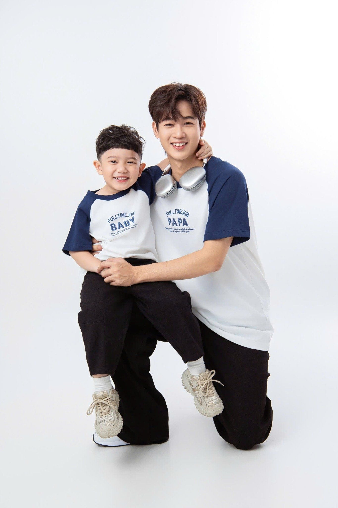 - Chi tiết chữ mặt trước áo chữ "FULL TIME JOB" in nổi kết hợp cùng chữ MAMA, PAPA, BABY được thêu 3D màu xanh navy.